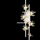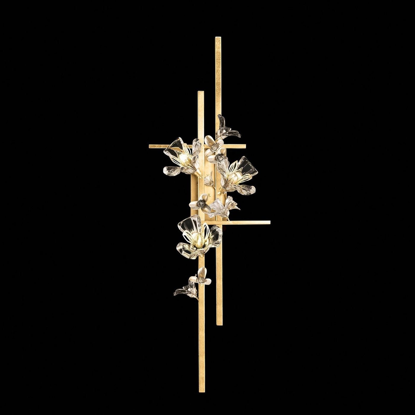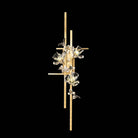 A tall statement wall sconce featuring floral-inspired crystal elements and brushed metal details for a luxurious glow.