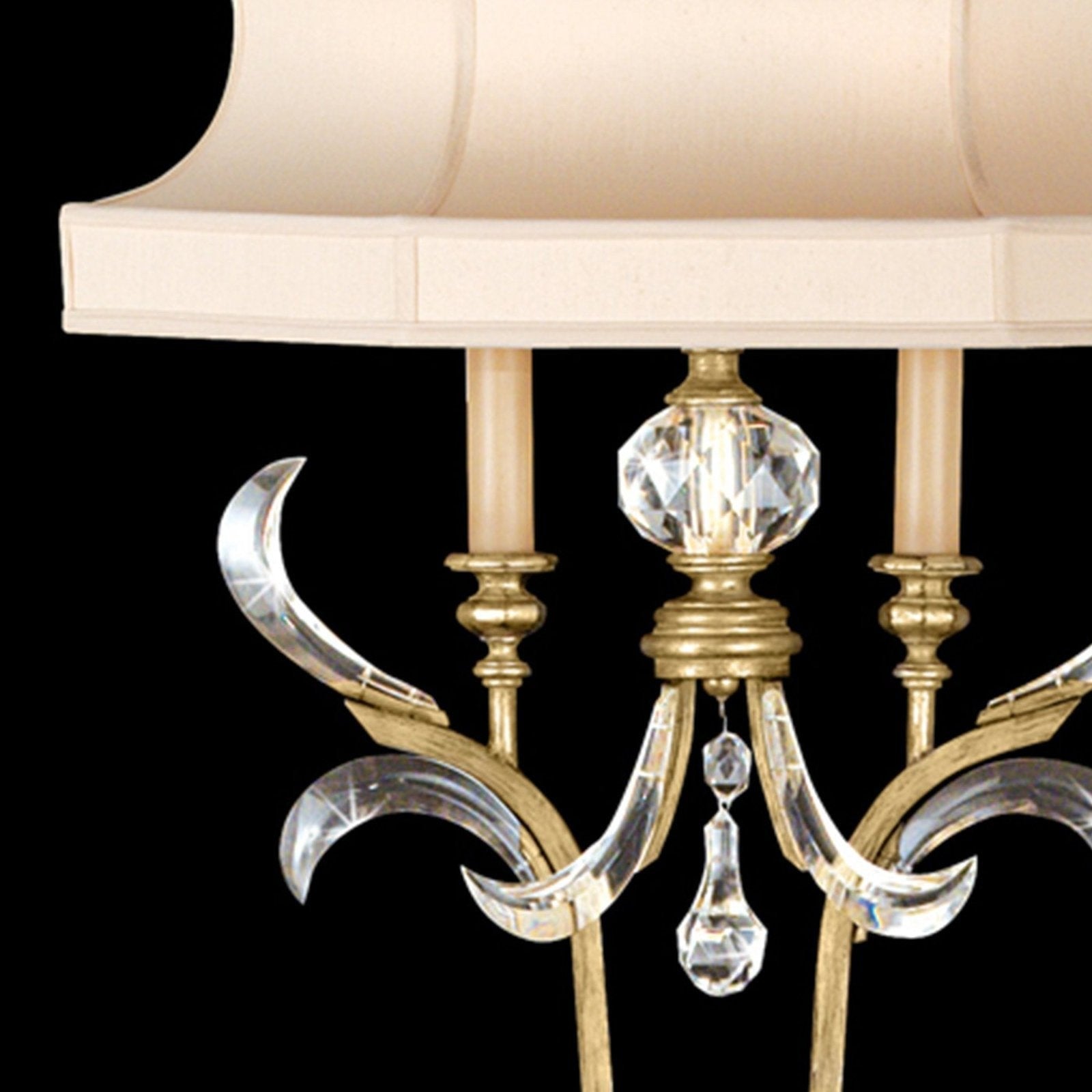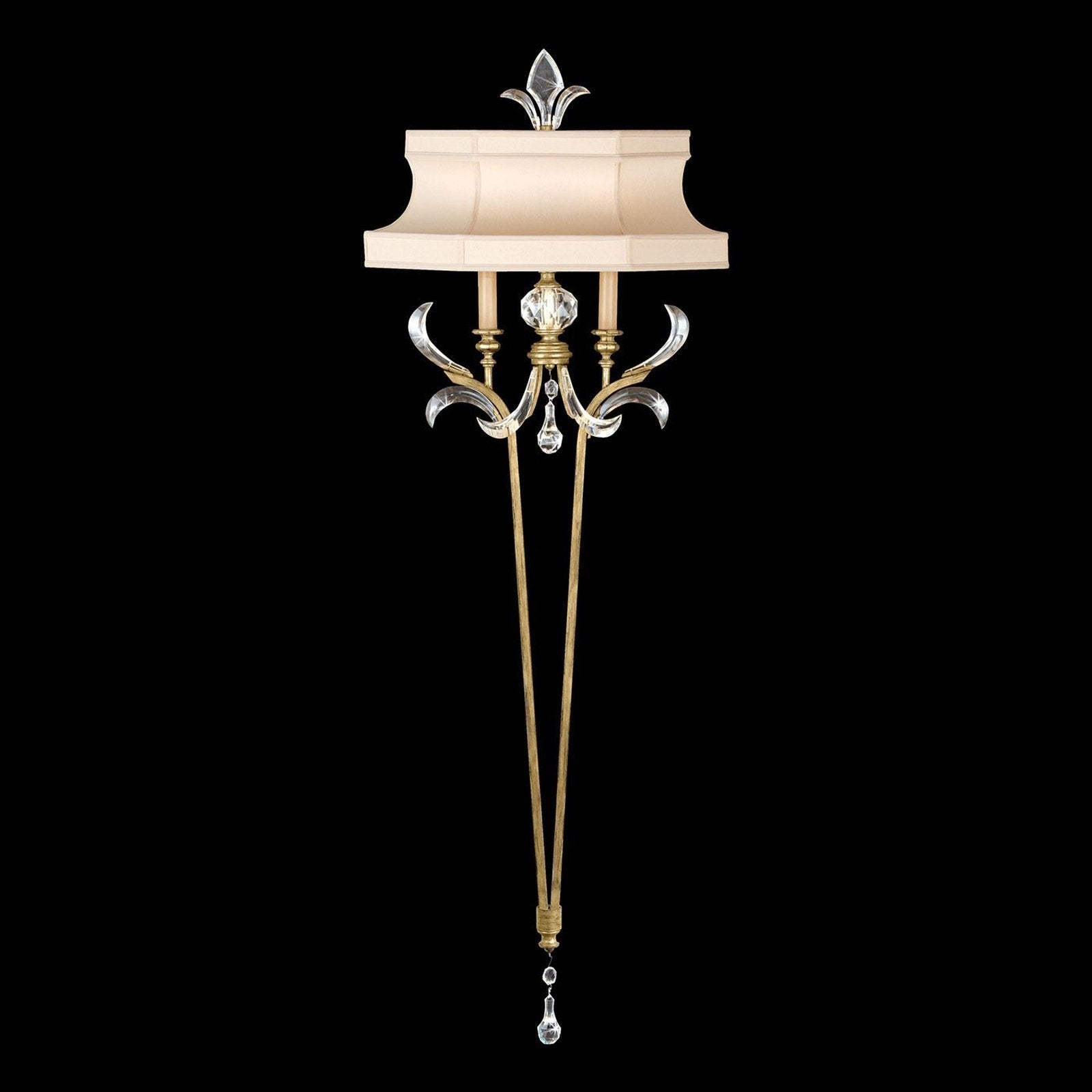 An oversized wall sconce featuring sweeping beveled crystal arcs that create dramatic reflections and architectural presence.