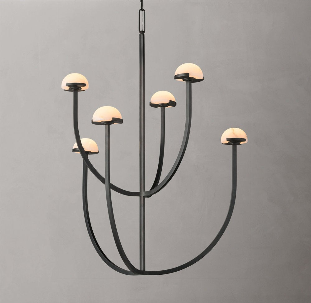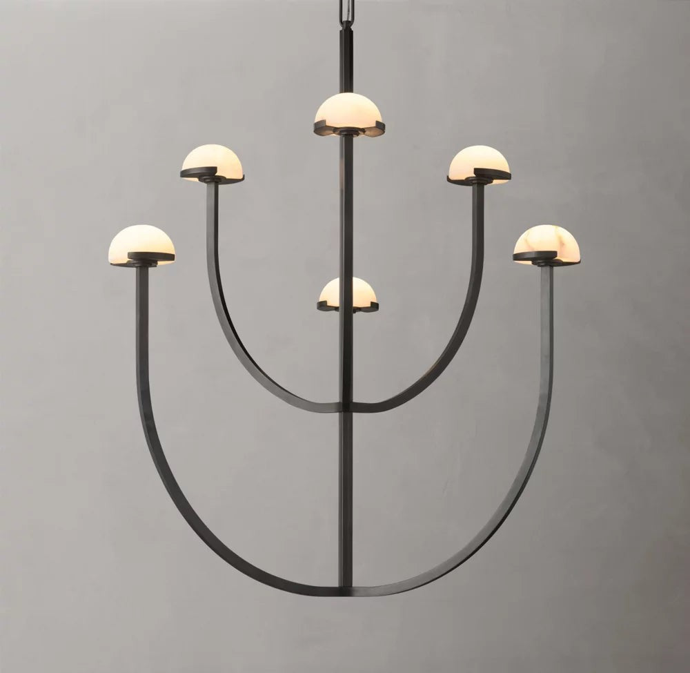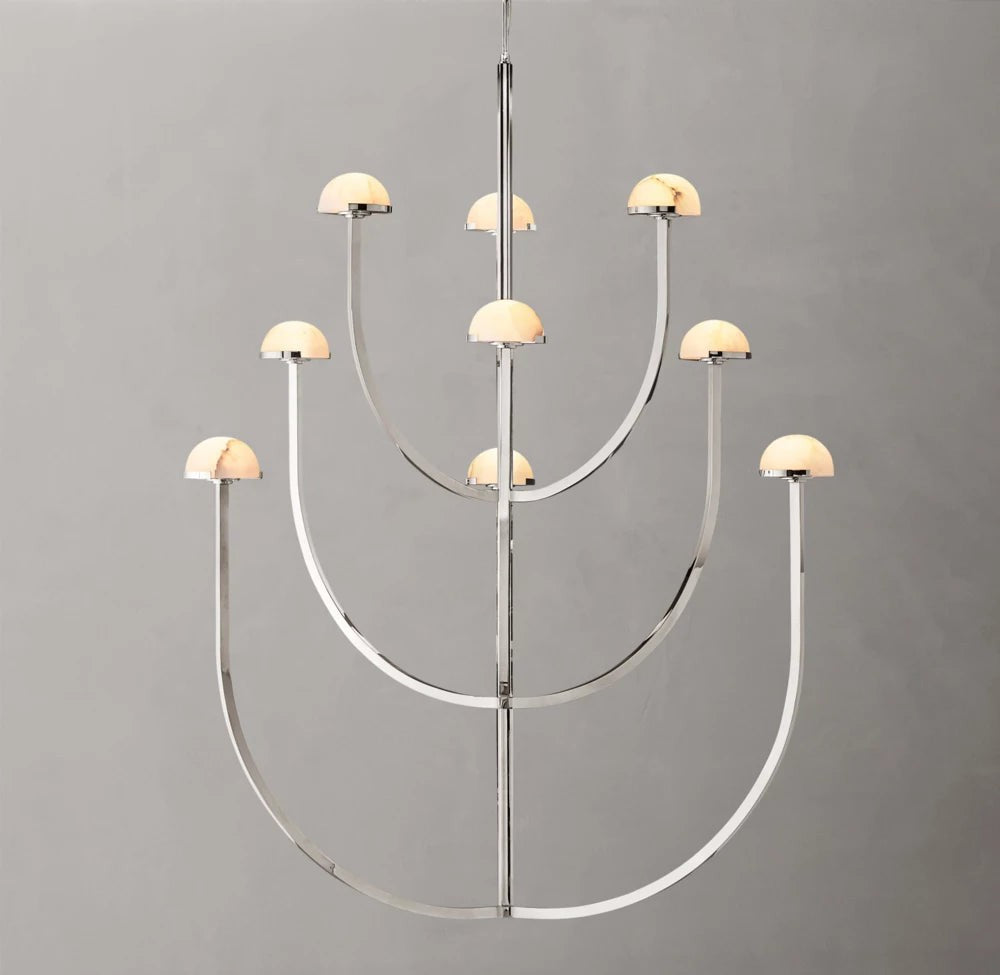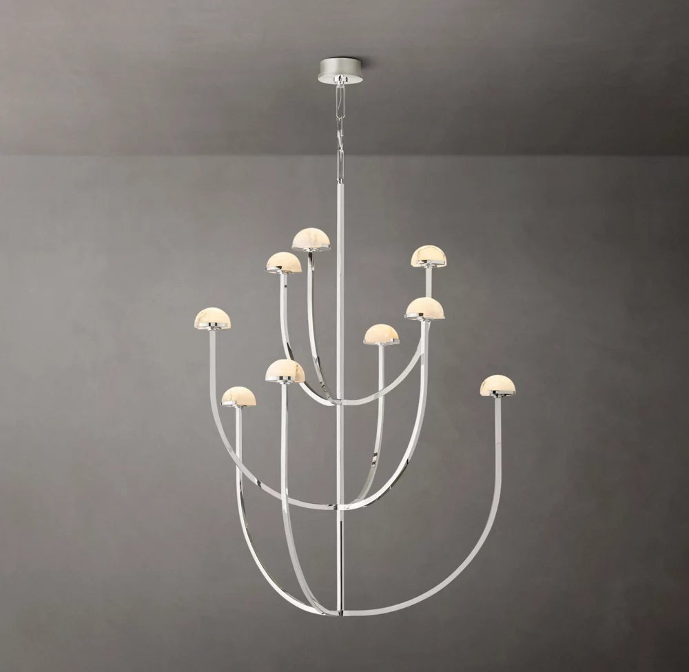 A refined blend of natural material and modern form, this chandelier features smooth alabaster shades arranged along a circular brass frame. Its soft, diffused illumination enhances interiors with warmth and understated elegance.