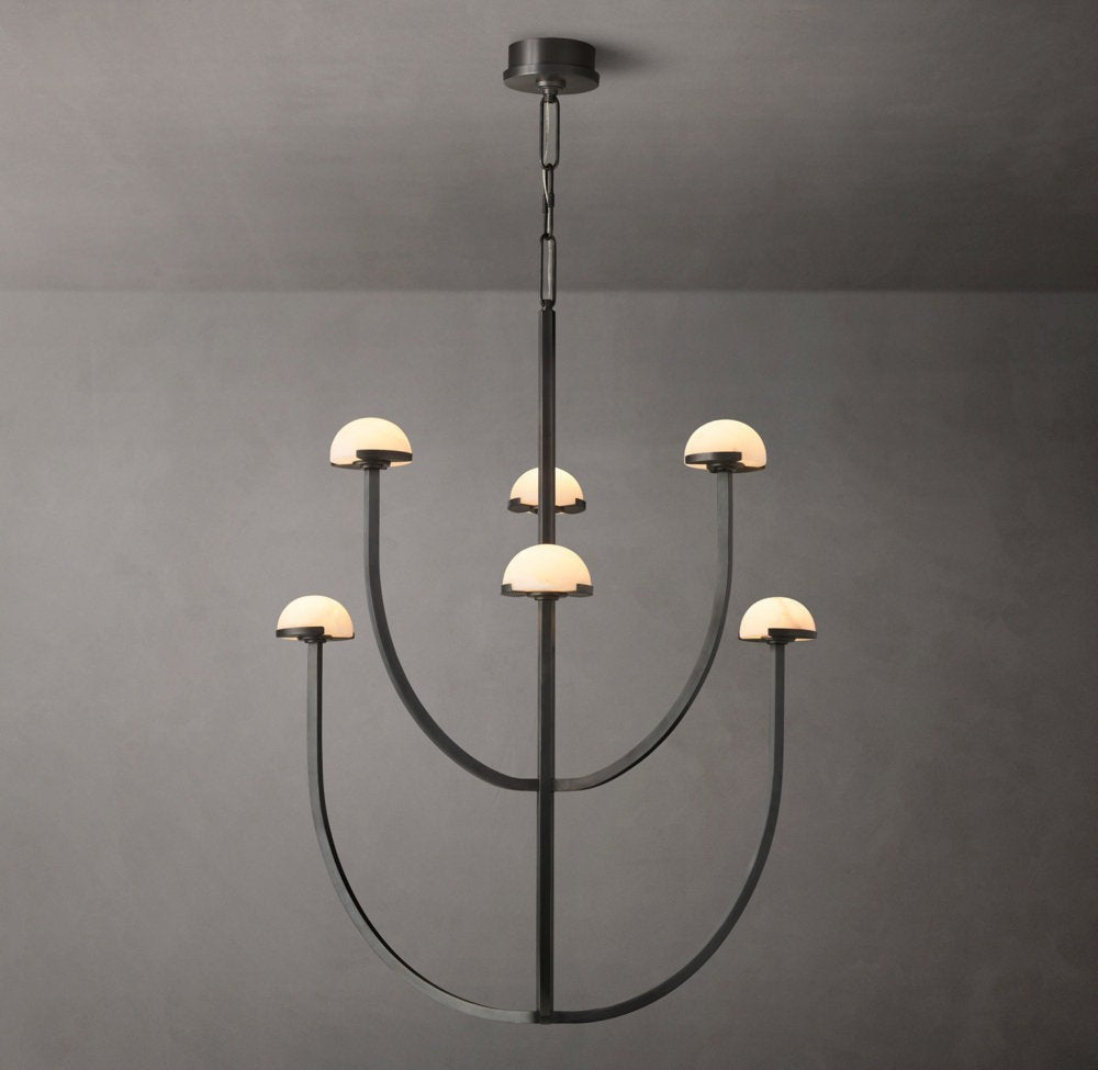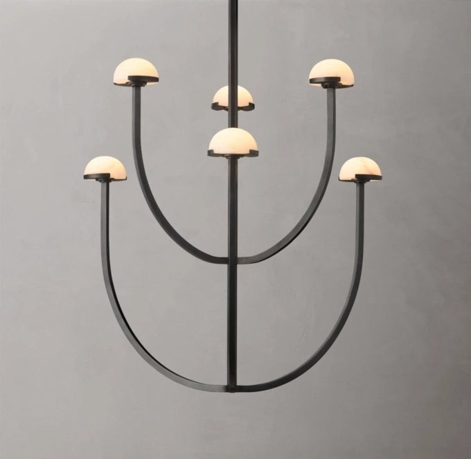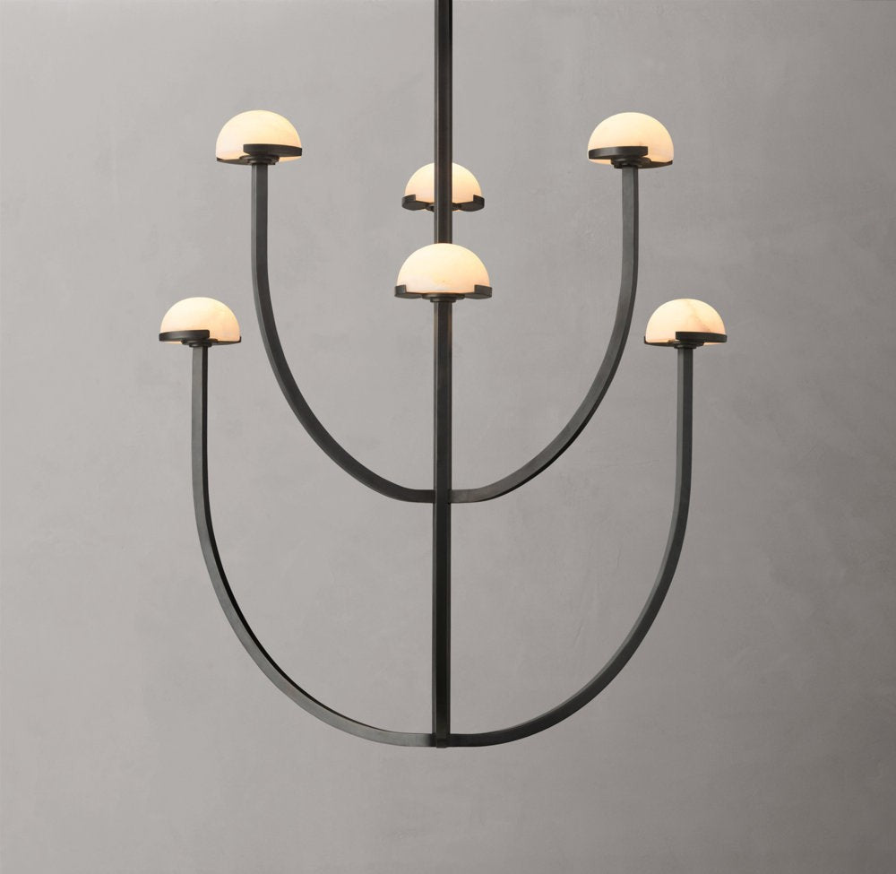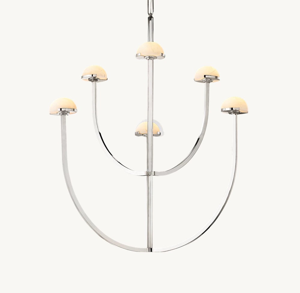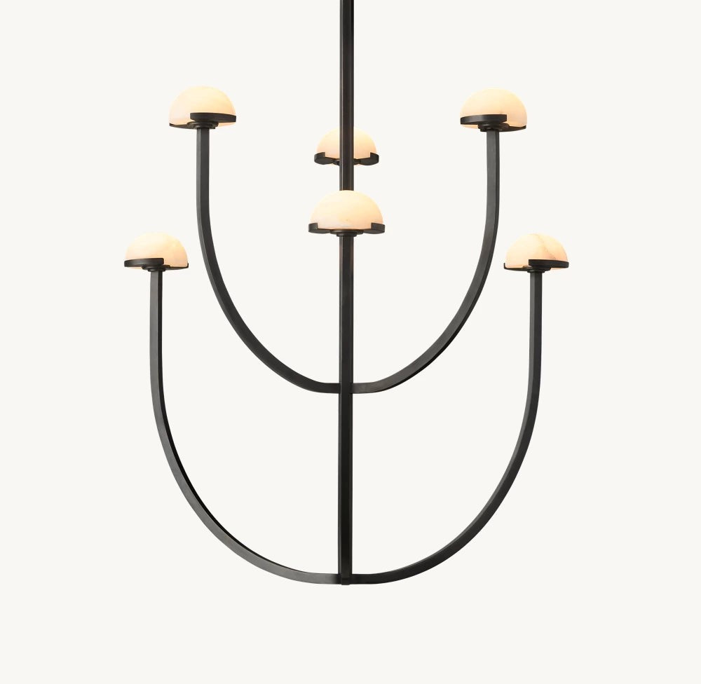 A refined blend of natural material and modern form, this chandelier features smooth alabaster shades arranged along a circular brass frame. Its soft, diffused illumination enhances interiors with warmth and understated elegance.