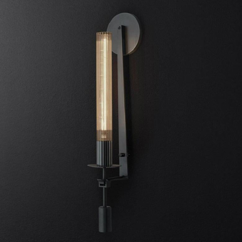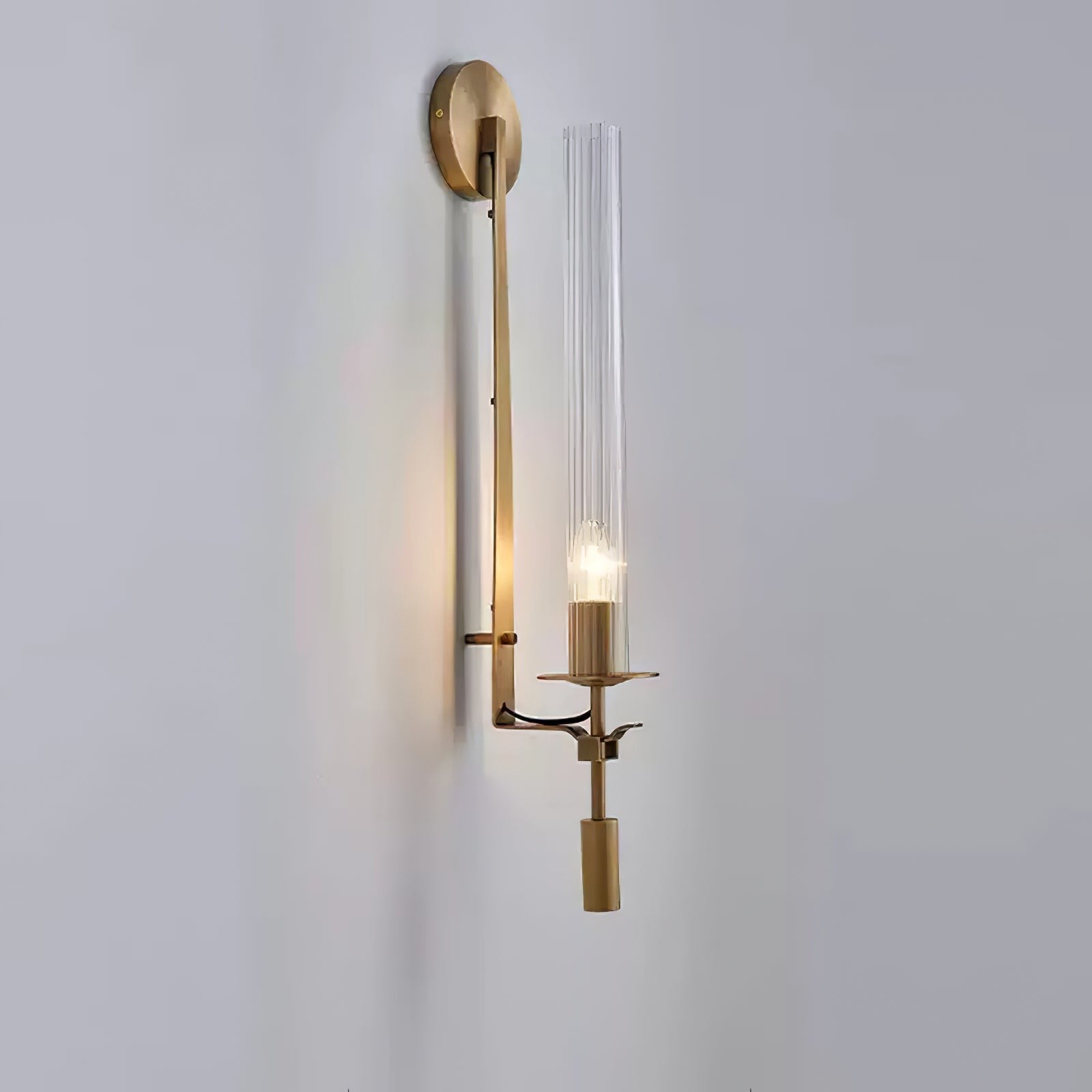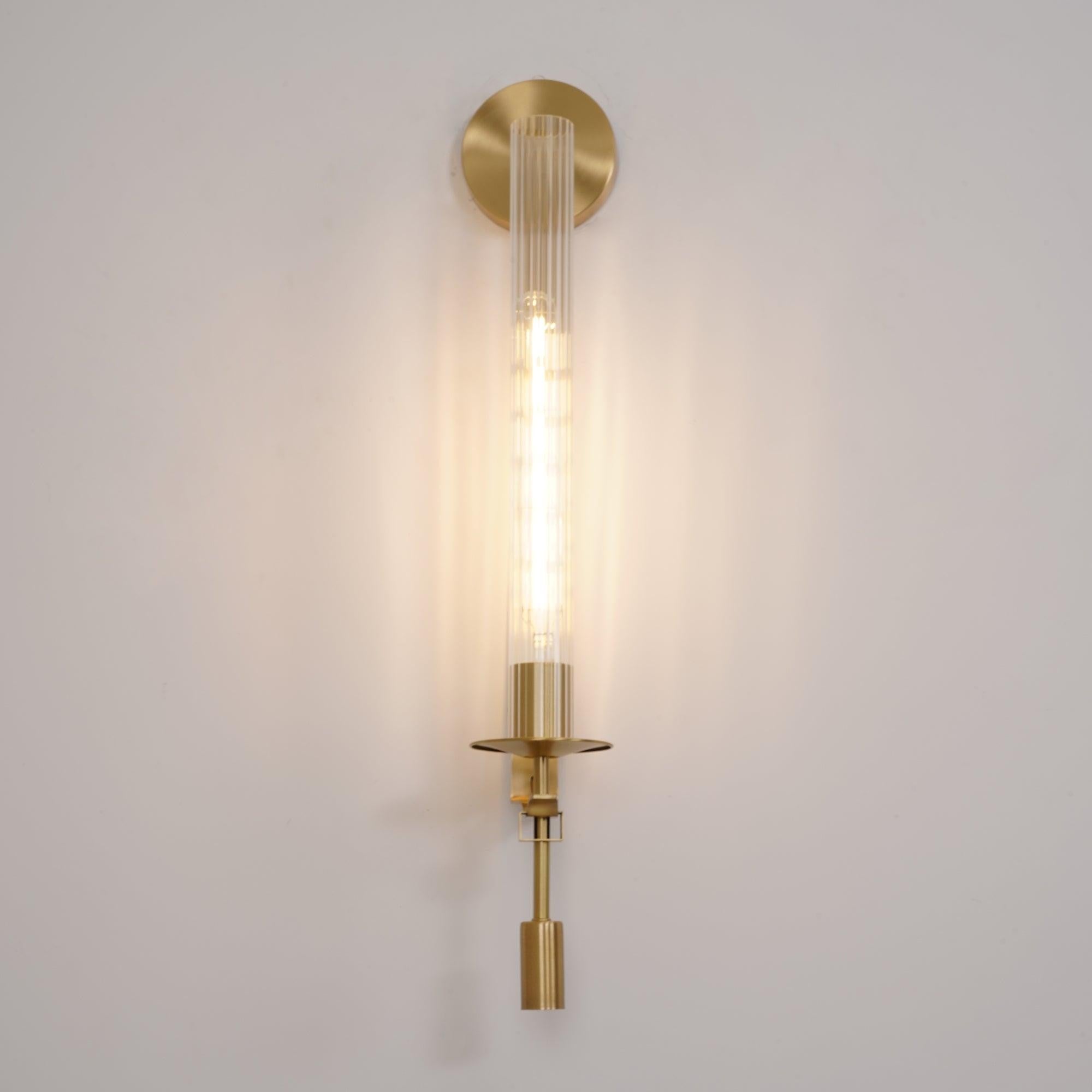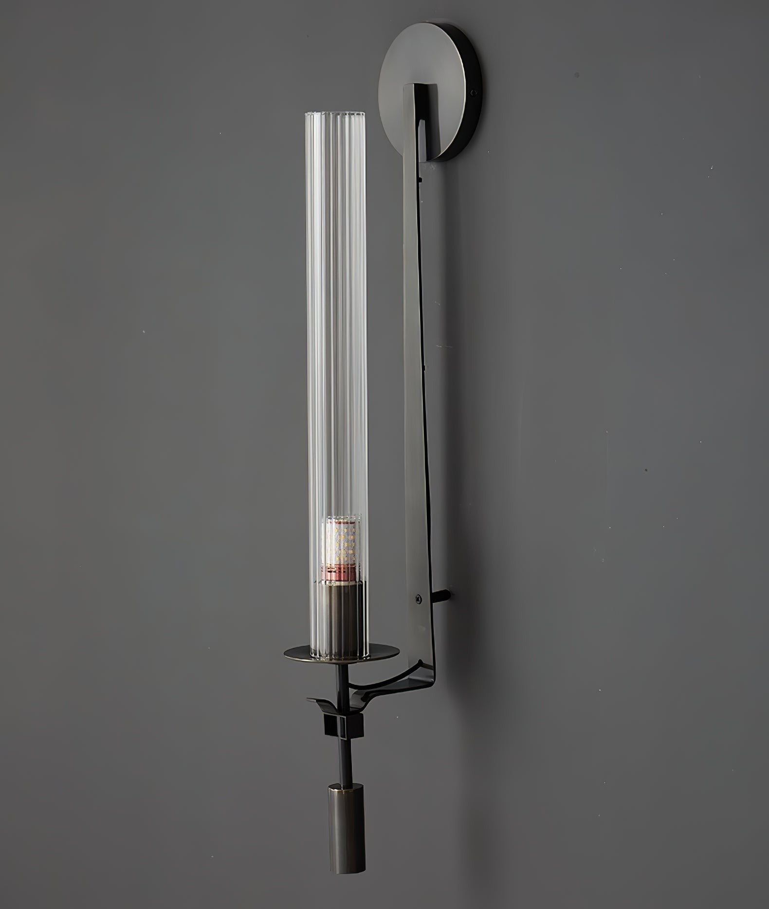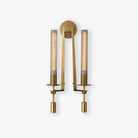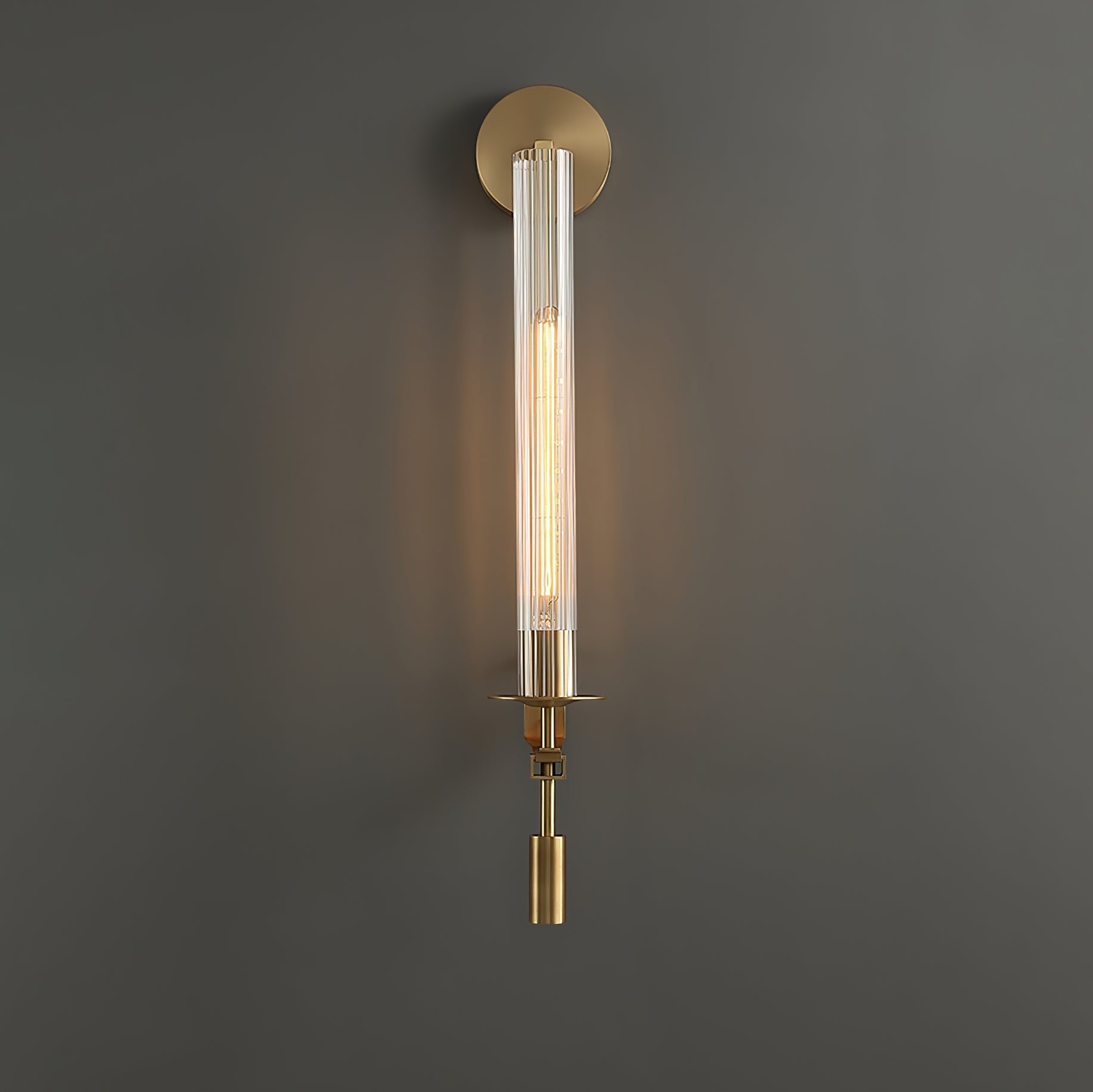 Drawing inspiration from 1940s Parisian design, this elegant wall light features ribbed glass cylinders that shimmer like candlelight. Its solid brass structure and timeless silhouette bring an air of refinement to any space.