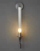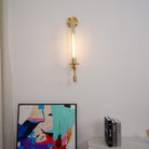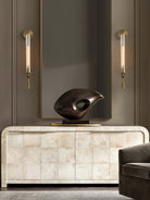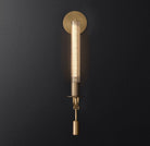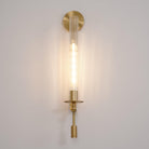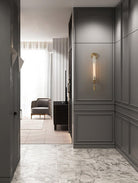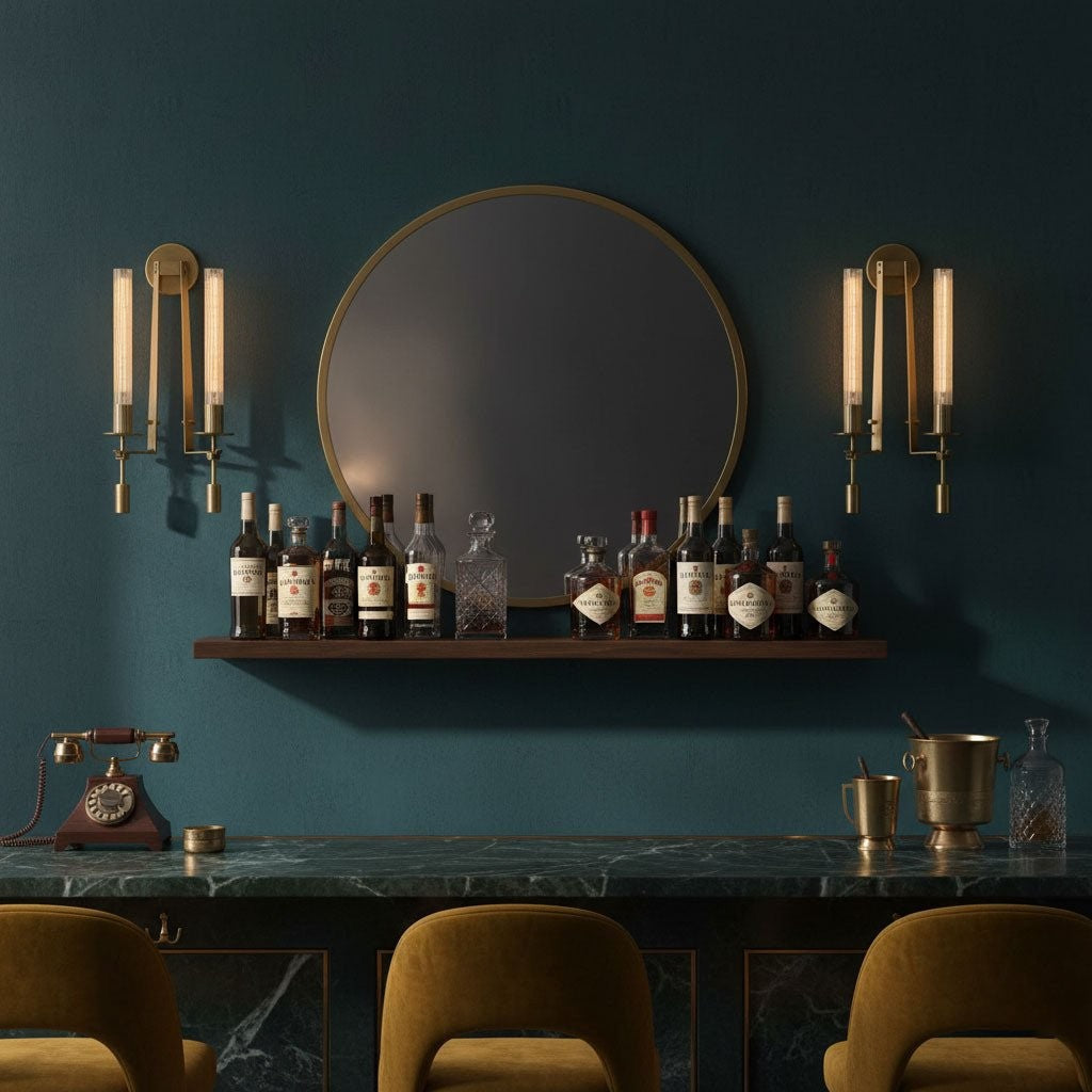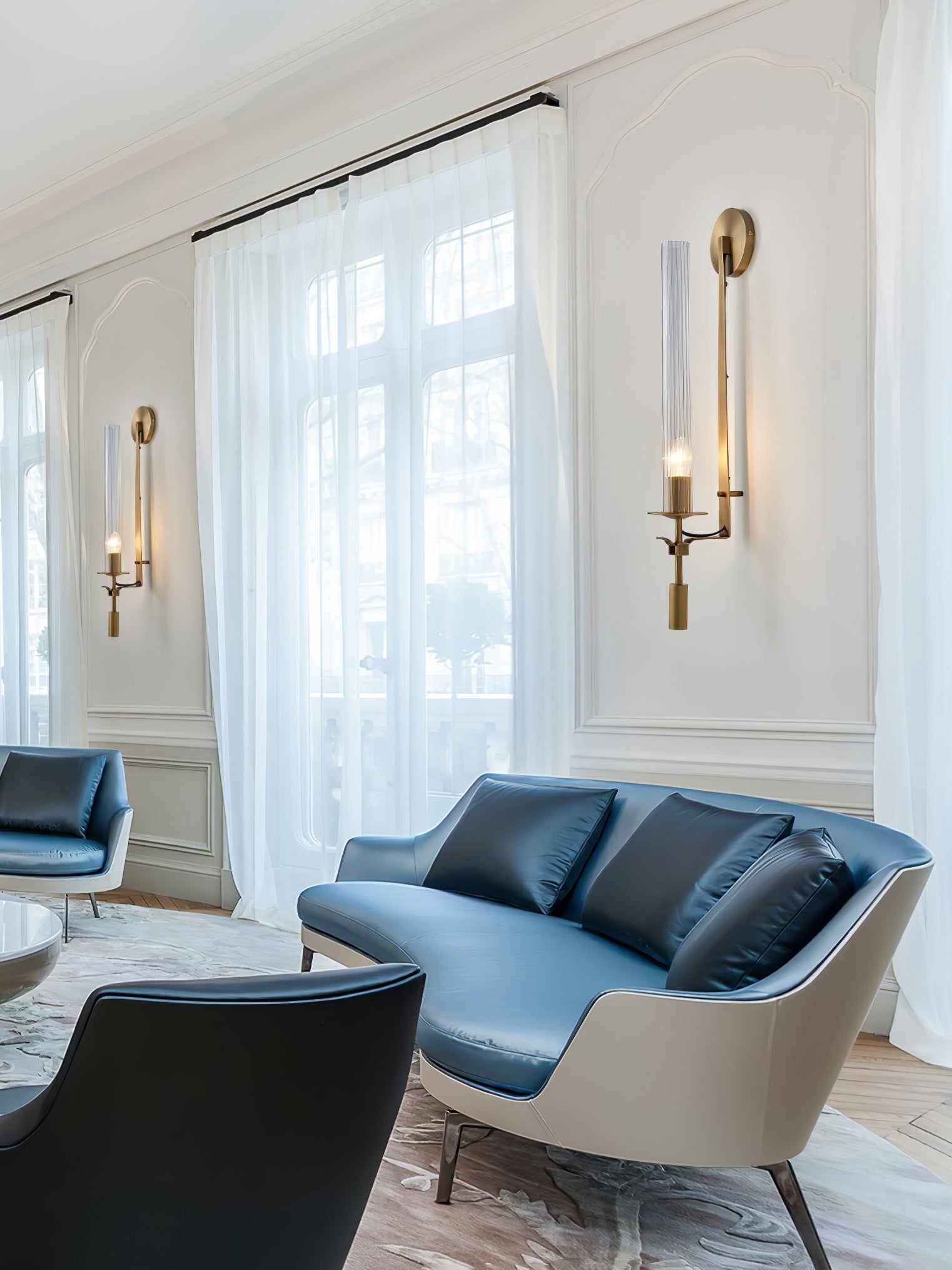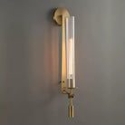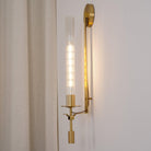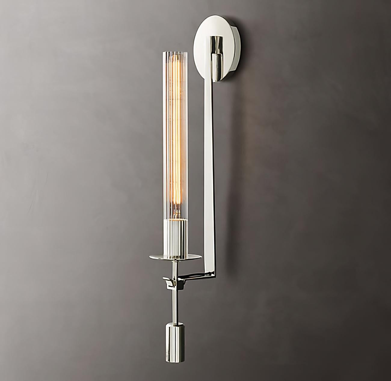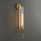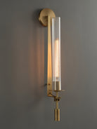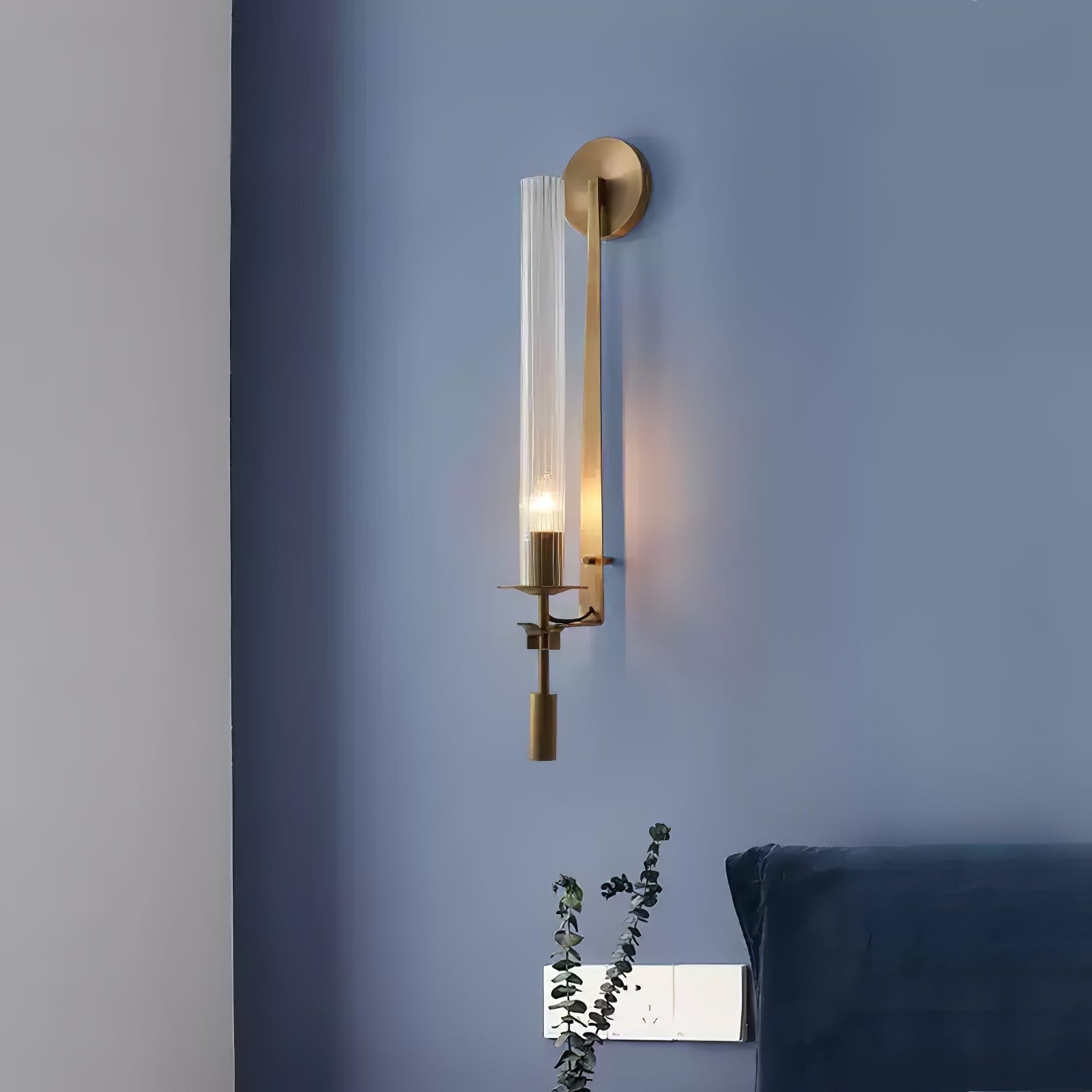 Drawing inspiration from 1940s Parisian design, this elegant wall light features ribbed glass cylinders that shimmer like candlelight. Its solid brass structure and timeless silhouette bring an air of refinement to any space.