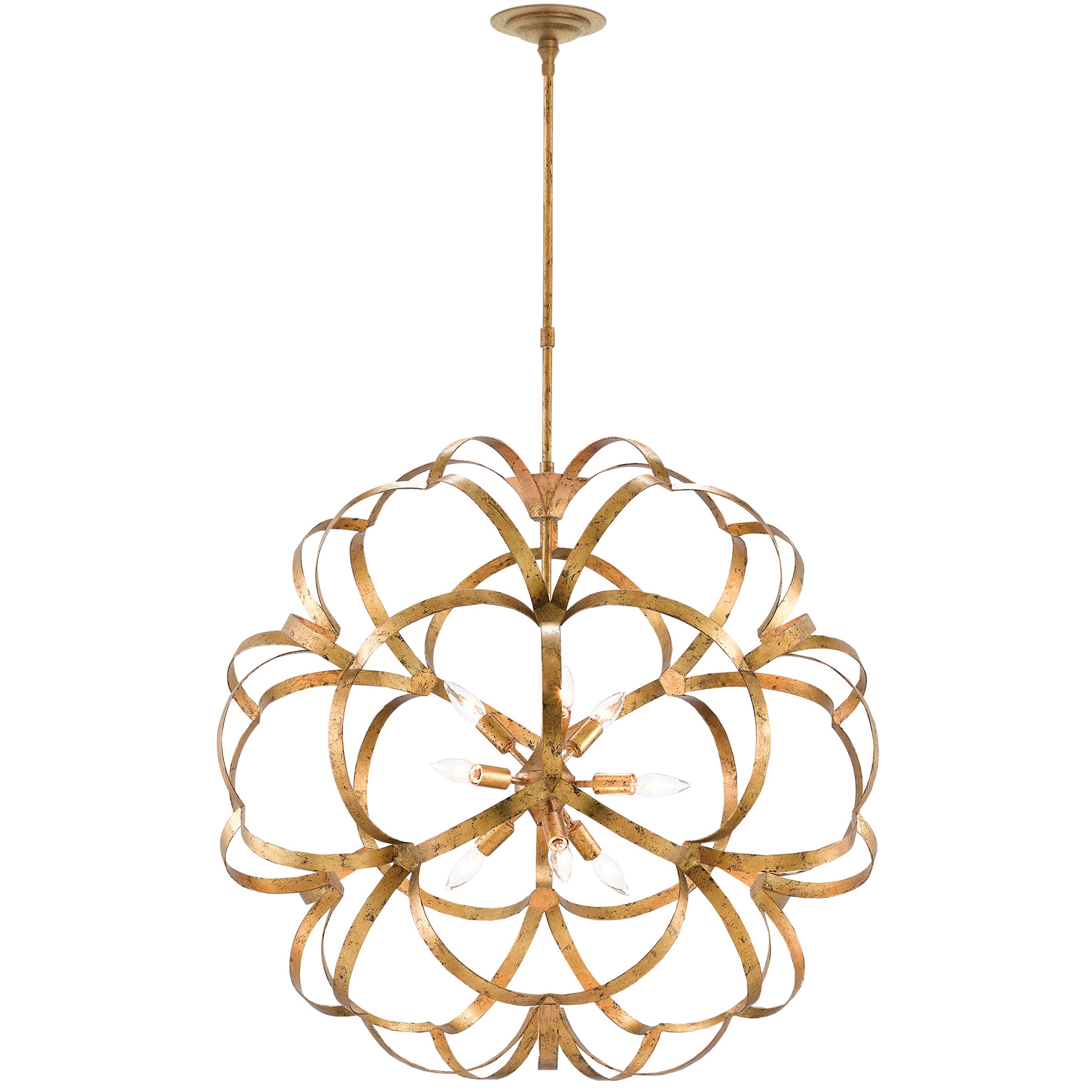 A striking orb-style chandelier finished in gold leaf, offering a sculptural presence with evenly distributed illumination. Its open spherical frame adds depth and elegance to any space.