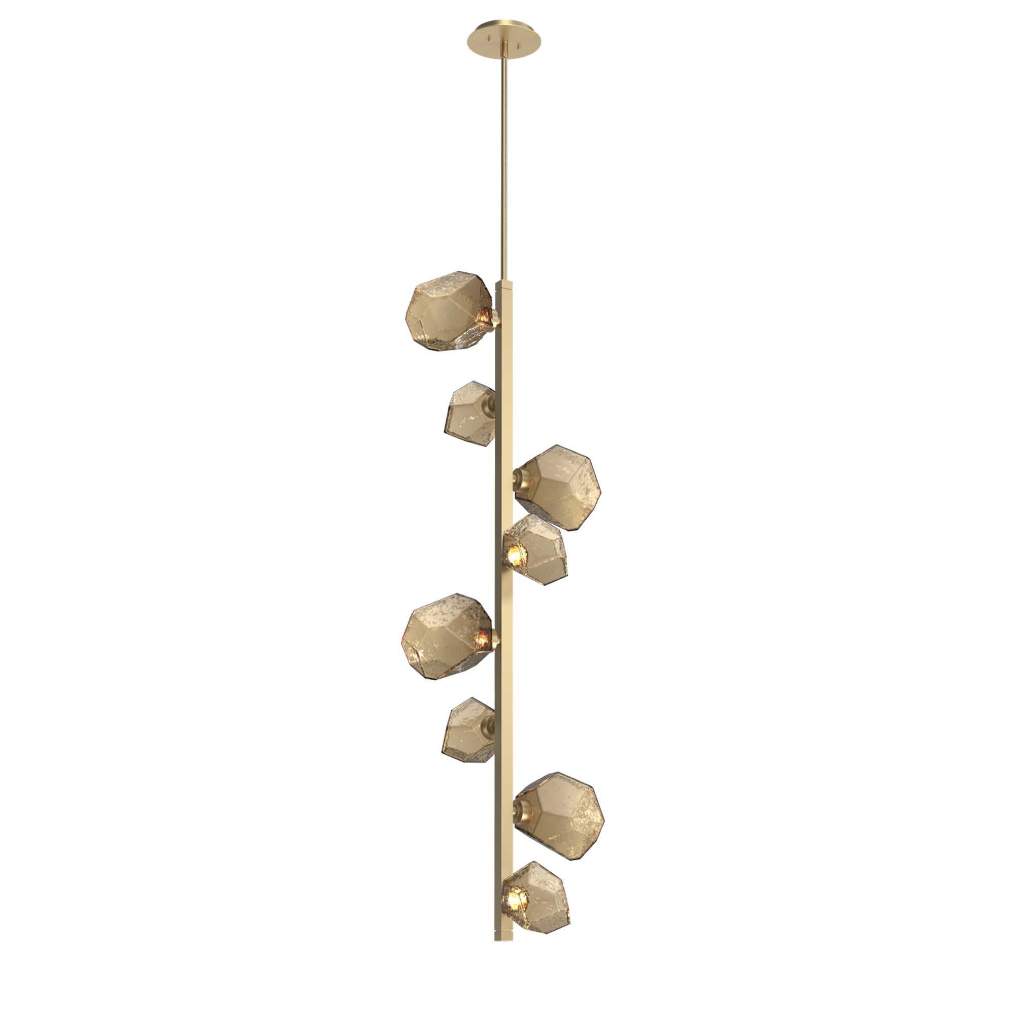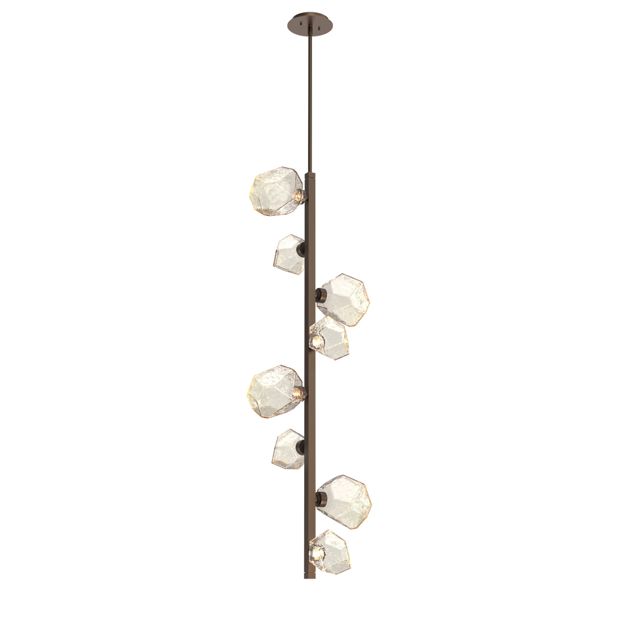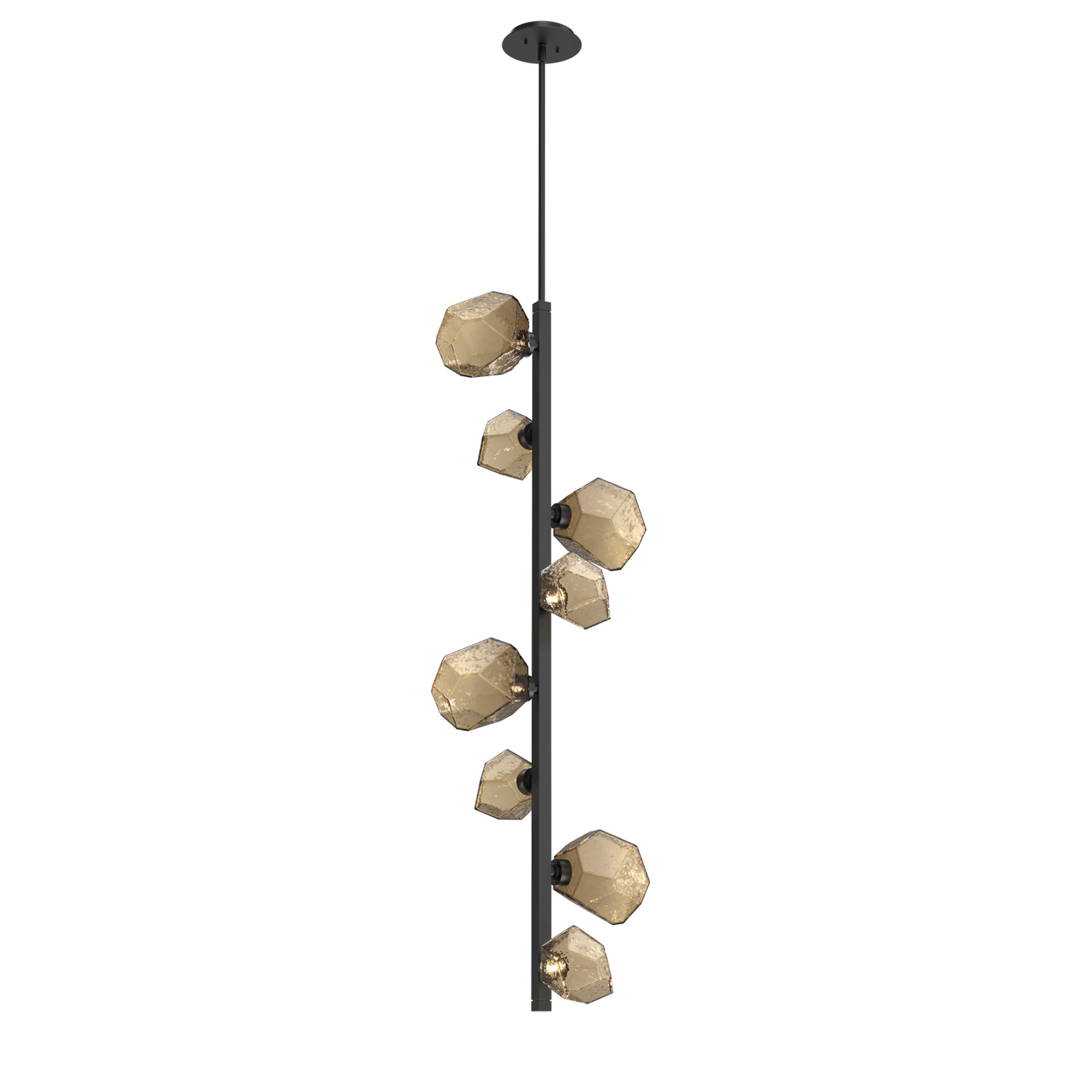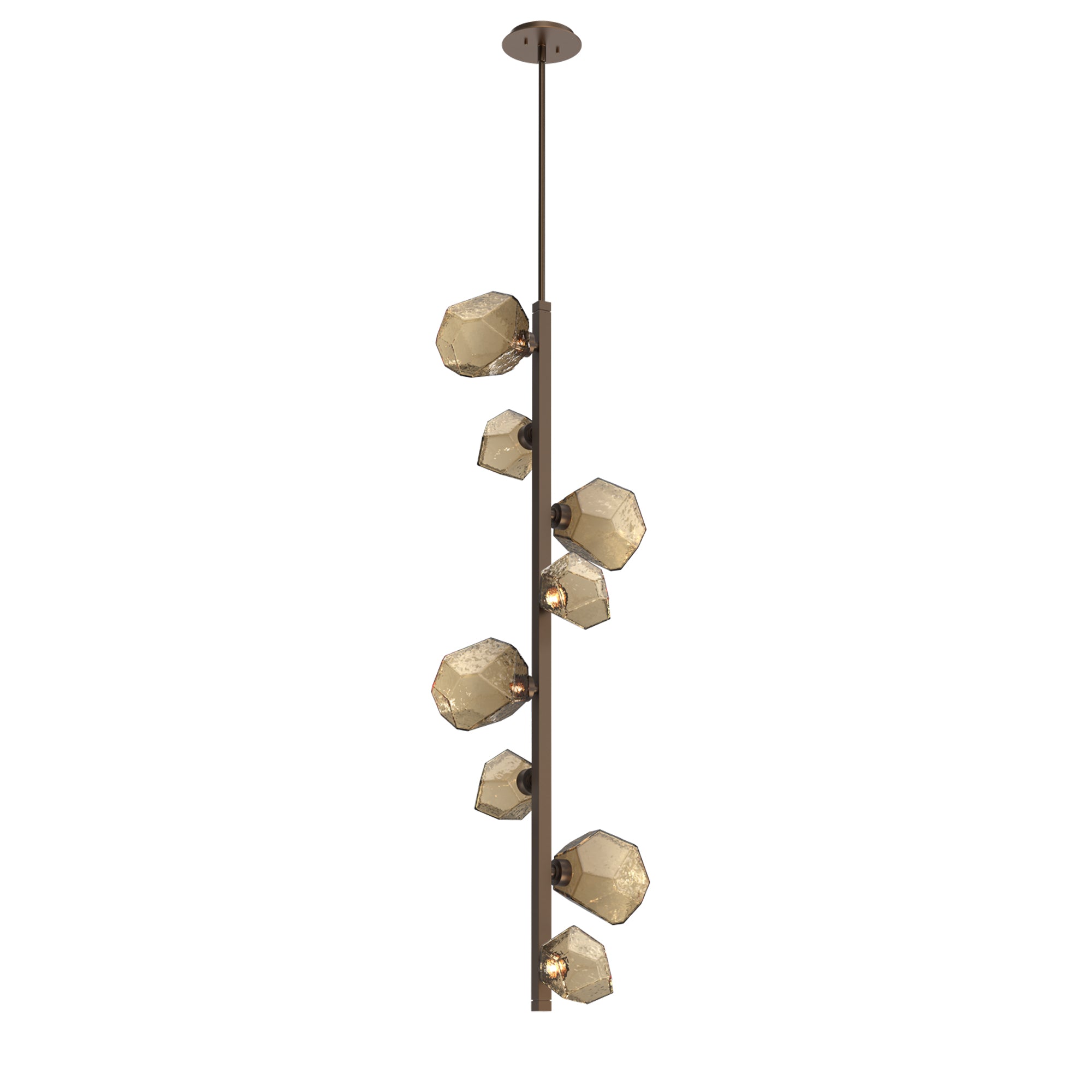 An artistic chandelier featuring a twisted vine design with amber glass accents and a flat bronze finish. Integrated LEDs provide warm and efficient illumination.
