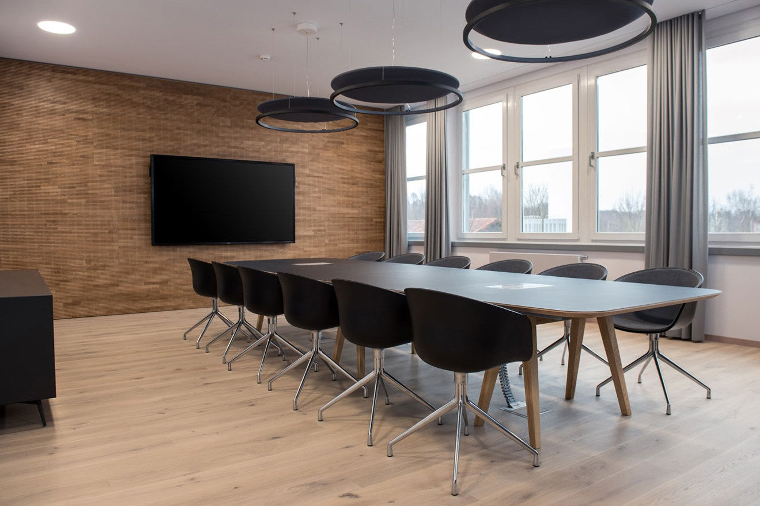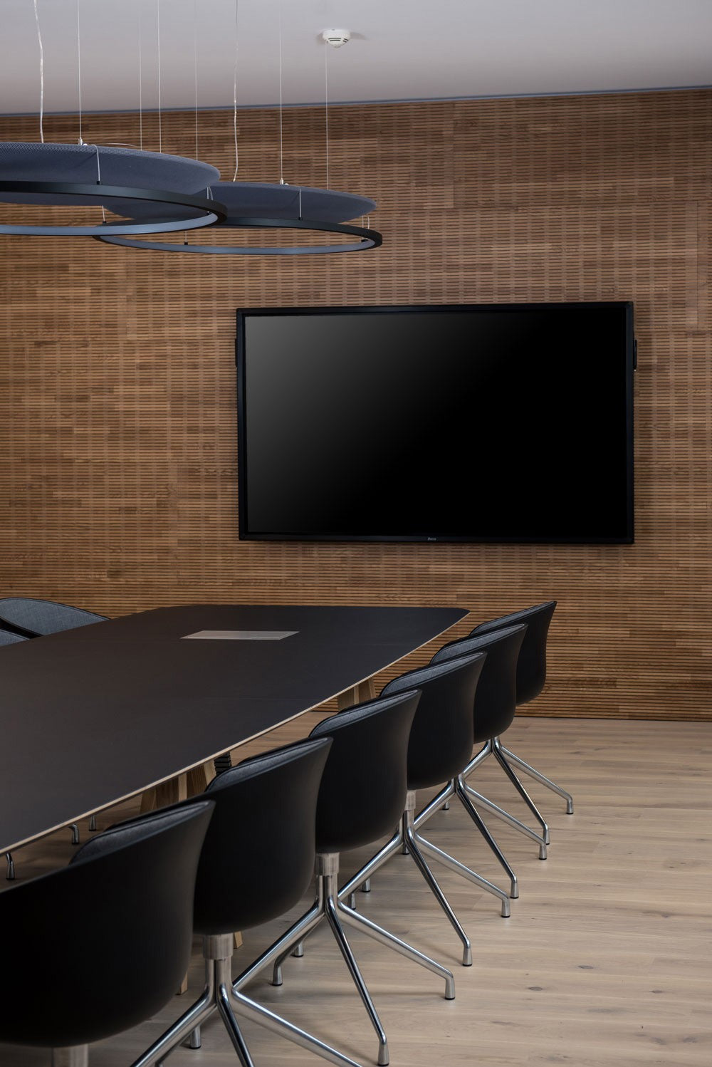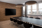 A multifunctional pendant combining acoustic dampening with high-output LED lighting, designed for modern commercial or open residential environments.