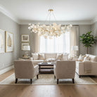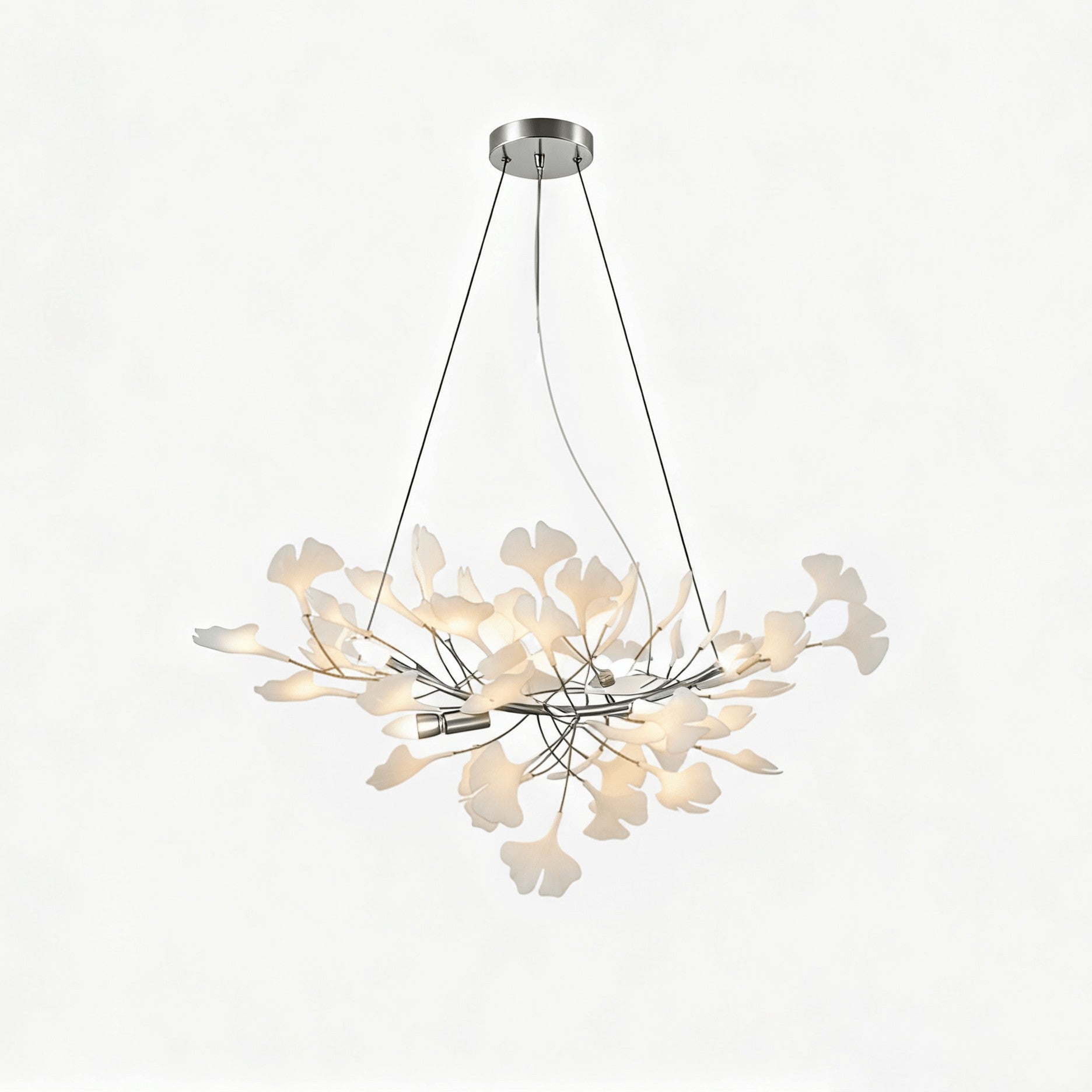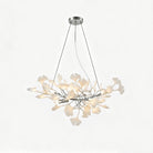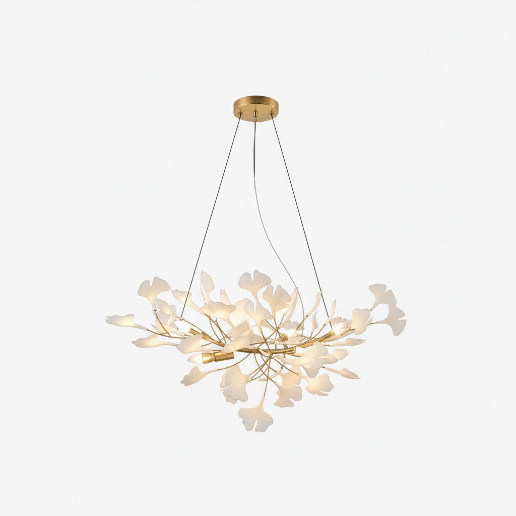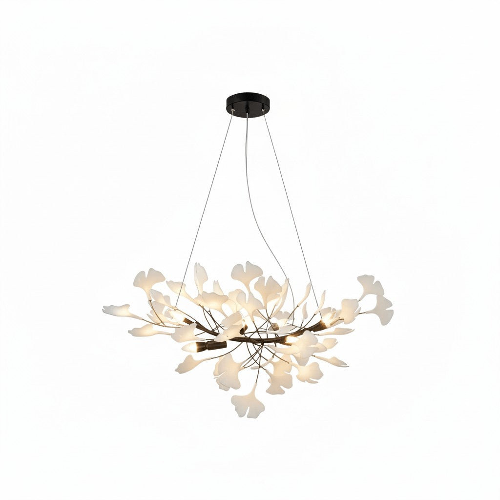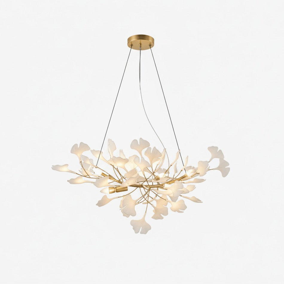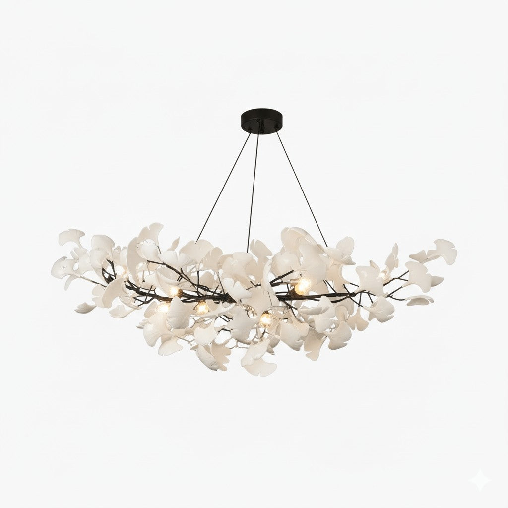 Graceful and poetic, this chandelier captures the beauty of nature through its cascading porcelain ginkgo leaves. Each delicate petal rests on a lustrous metal frame, creating a tranquil glow that feels both organic and refined — a perfect harmony of craftsmanship and artistry.