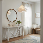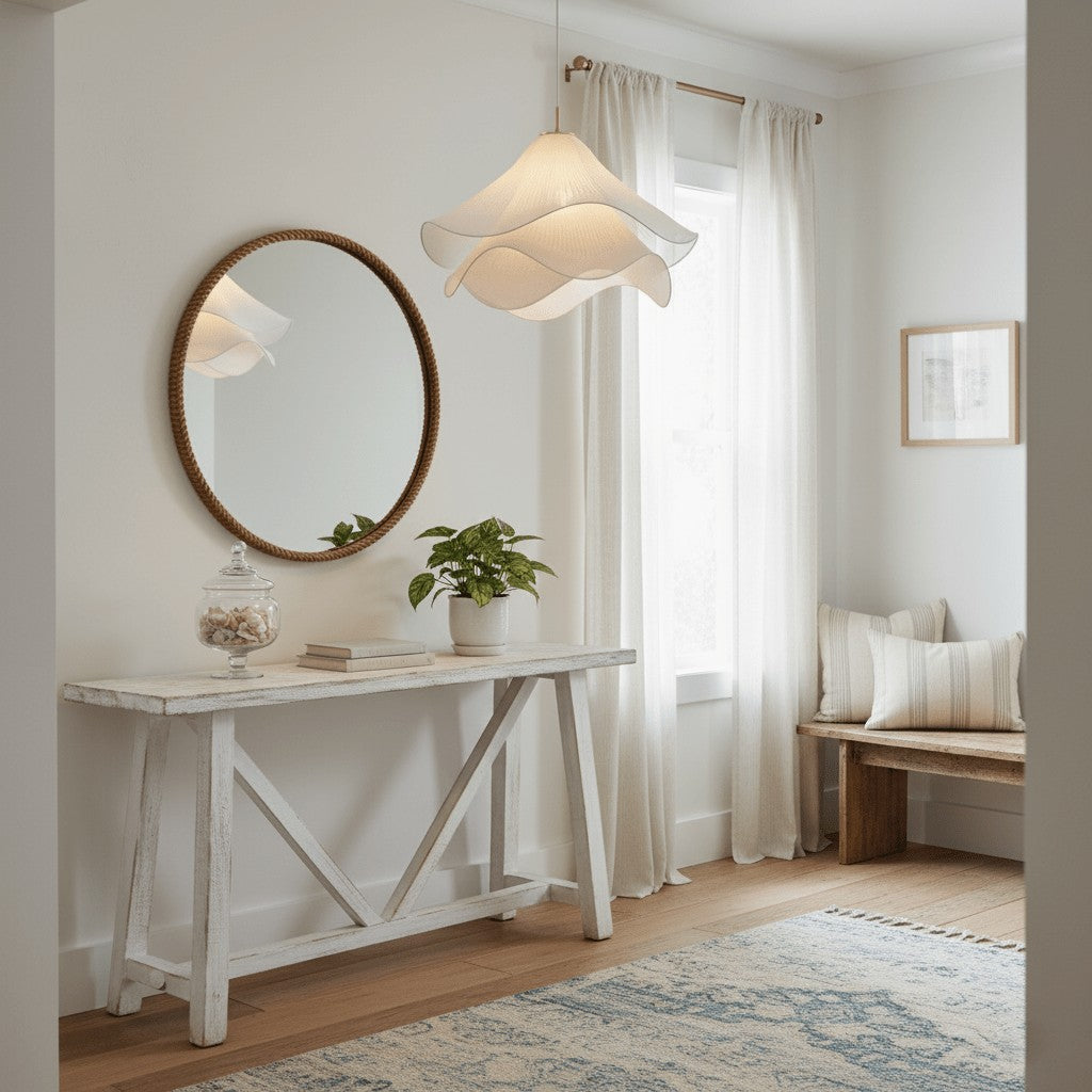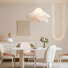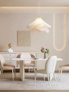 Airy and poetic, the Whisper Bloom Pendant drapes layers of pleated white fabric into a soft, sculptural form that seems to float in midair. Gentle light filters through each fold, creating an elegant glow that feels as delicate as a flower in bloom — perfect for dining rooms, bedrooms, or serene living spaces.